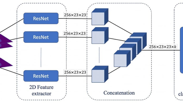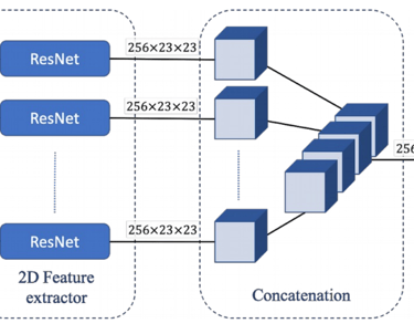 Une architecture d'apprentissage profond associant un extracteur de caractéristiques 2D à un prédicteur CNN 3D. Elle tire parti d'un modèle 2D pré-entraîné pour extraire des cartes de caractéristiques à partir de coupes TEP 2D. Elle applique ensuite un CNN 3D à la concaténation des feature maps précédemment extraites afin de calculer des prédictions pour chaque patient. Le pipeline proposé surpasse les approches radiomiques TEP en matière de prédiction des récidives loco-régionales et de la survie globale.