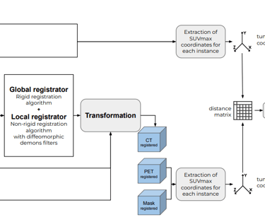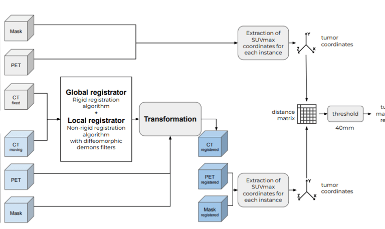Traditionnellement, les médecins nucléaires suivent manuellement les tumeurs, en se concentrant sur les cinq plus grosses (critères PERCIST), ce qui est à la fois long et imprécis. Le suivi automatisé des tumeurs permet une mise en correspondance précise et en temps réel des nombreuses lésions métastatiques entre les différents scanners. La méthode de suivi des tumeurs par recalage d'images proposée, bien qu'elle ne soit qu'une base de référence, fonctionne bien sur l'ensemble de données annotées, composé de cas simples.